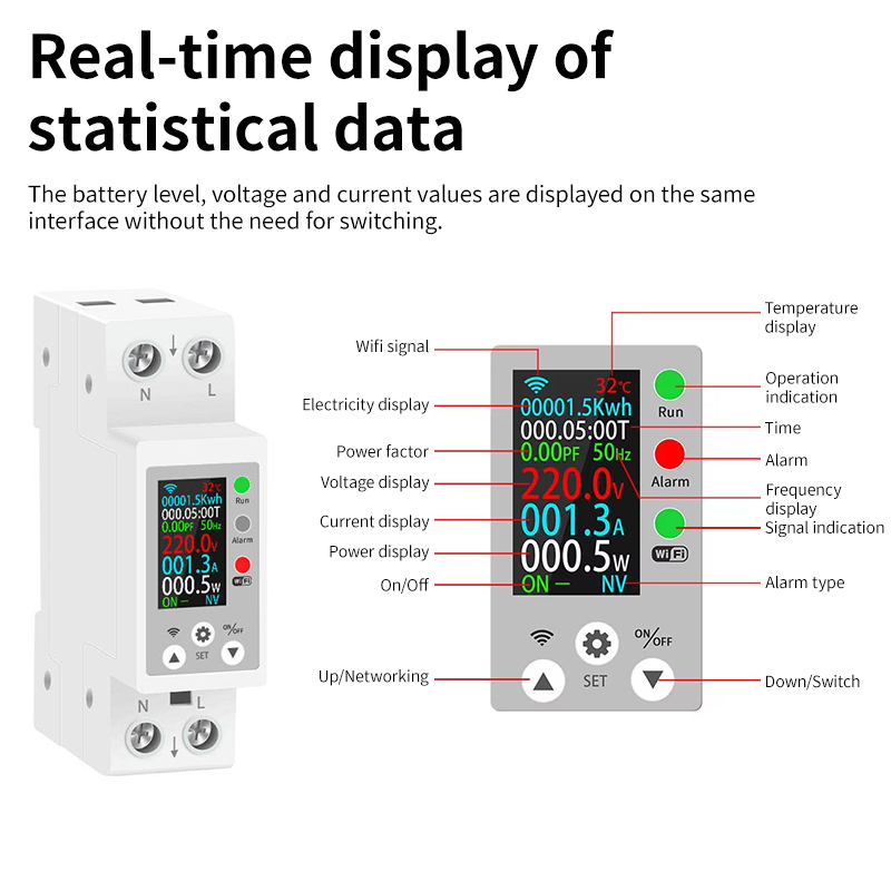 WiFi Smart Multi-functional Meter Circuit Earth Leakage Over Under Voltage Protector Color Display